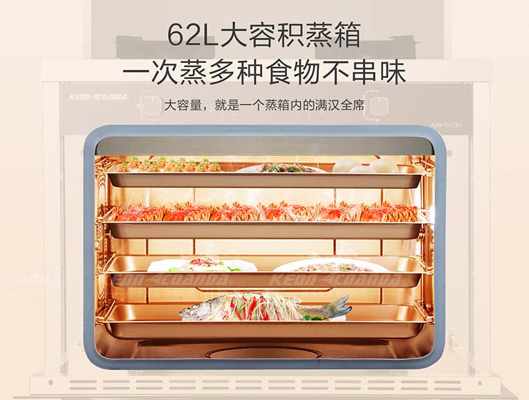集成灶十大品牌、廚電行業十大品牌科恩D123X蒸烤消一體集成灶,擁有62L大容積內膽,內部設有多層蒸架,選用進口“薩萊米”陶瓷加熱盤,噴氣式4D立體蒸,噴氣升溫快,能迅速讓蒸汽達到腔內各個區域,從而實現無冷角均勻加熱,蒸汽快速升騰,縮短了加熱的時間,鎖住了營養,實現食物的原汁原味,使烹飪更加鮮美!