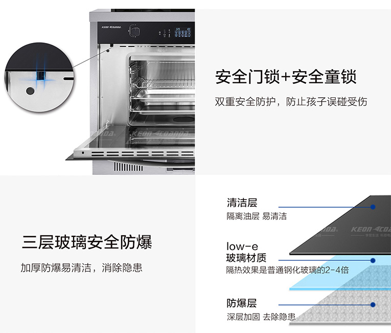 同時集成灶十大品牌、廚電行業十大品牌科恩蒸烤消一體集成灶蒸菜時也不會出現冷凝水滴落的現象,配備了蒸汽后排技術,蒸汽隨著風機自動排出,菜與菜之間不會串味,這樣出來的菜品也就色香味俱全!另外箱門還有多層高溫防護技術,在普遍的耐高溫鋼化玻璃基礎上,中間再置入一層Low-e玻璃材質,隔熱效果是普通鋼化玻璃的2-4倍,避免不小心燙傷皮膚。