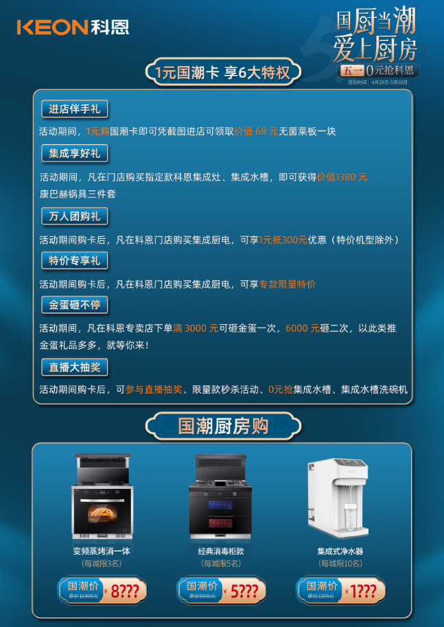 凡是購買1元國(guó)潮卡的用戶即可參與直播大抽獎(jiǎng)活動(dòng):無菌菜板、PP棉濾芯、便攜榨汁杯、凈水龍頭、章丘鐵鍋、康巴赫鍋具三件套、集成水槽、集成水槽洗碗機(jī)...海量壕禮發(fā)不停!!!活動(dòng)精彩紛呈,直播間也熱鬧非凡,全國(guó)各地的朋友們積極參與,用指尖傳遞著國(guó)廚當(dāng)潮,愛上廚房的精致廚房新理念。