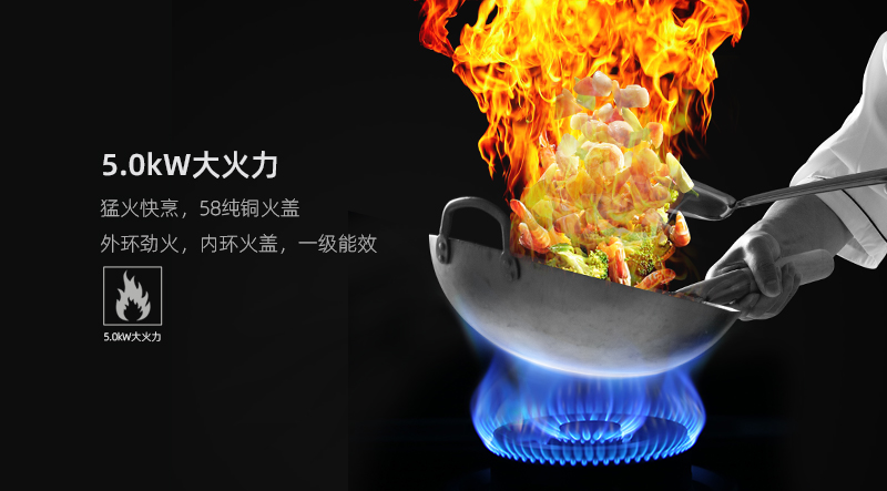 5.0KW大火力,猛火快烹,沉浸大廚級烹飪體驗,為愛火力全開,颶風大吸力,油煙不過臉,護你的無瑕容顏,更愛你的傾盡全力。