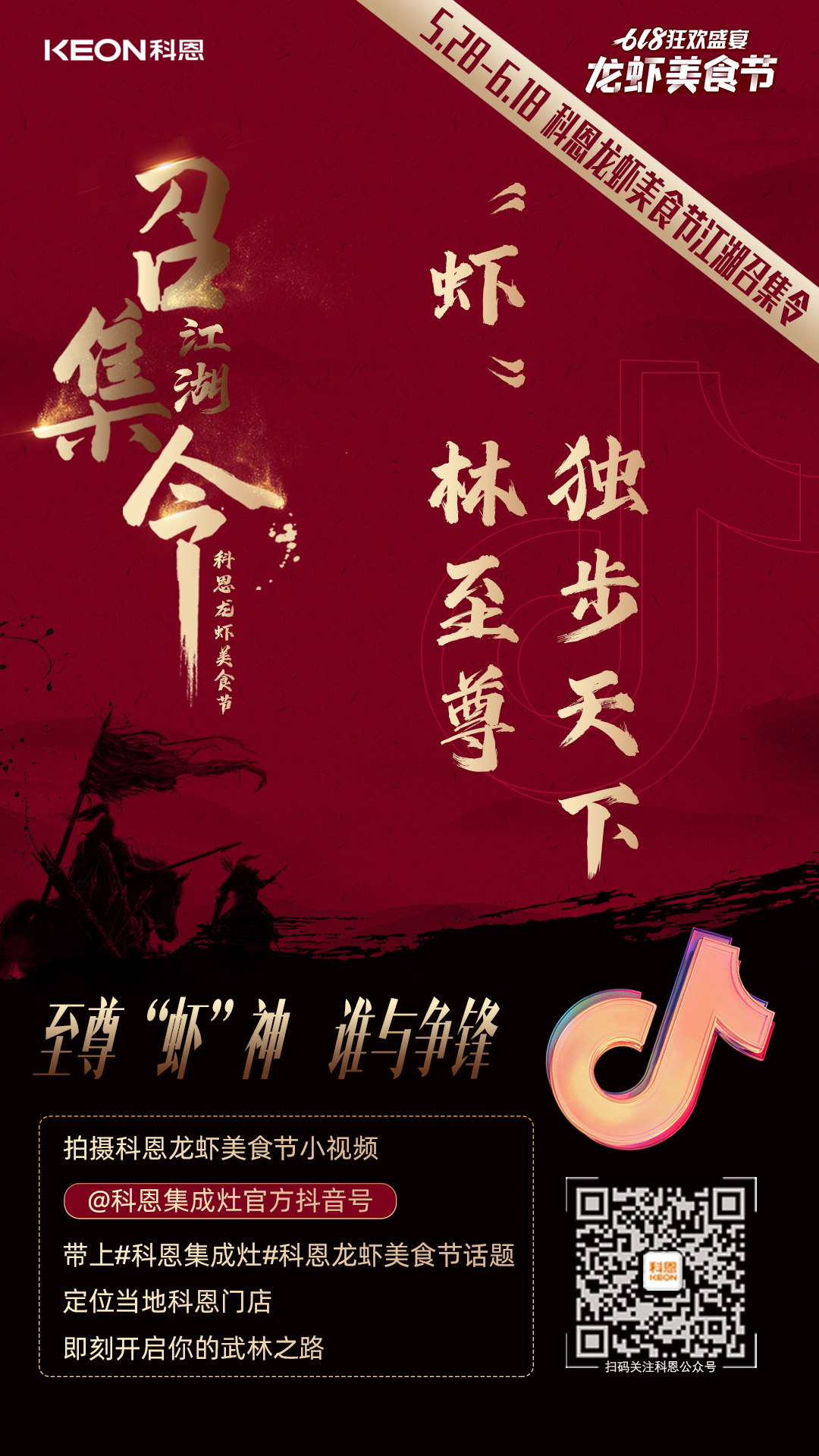 各位俠士,請(qǐng)妥存這份武林大會(huì)規(guī)則寶典,江湖美味,缺你不可!只要關(guān)聯(lián)科恩龍蝦美食節(jié),體現(xiàn)科恩元素并上傳至私人抖音號(hào),@浙江科恩電器有限公司官方抖音號(hào),帶上話題#科恩龍蝦美食節(jié) #科恩集成灶,定位當(dāng)?shù)乜贫鏖T店位置即可!