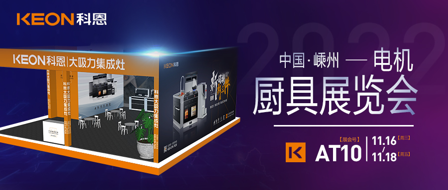 2022年11月16日-18日,第十五屆中國(嵊州)電機 ·廚具展覽會將在中國廚具之都——嵊州隆重開幕,科恩集成灶作為廚電行業(yè)領軍品牌受邀參加本次展會(展會號:AT10)