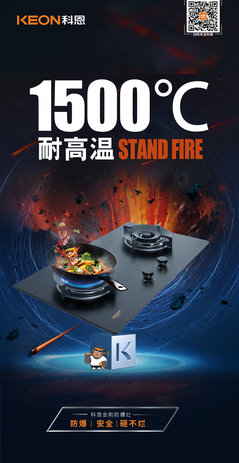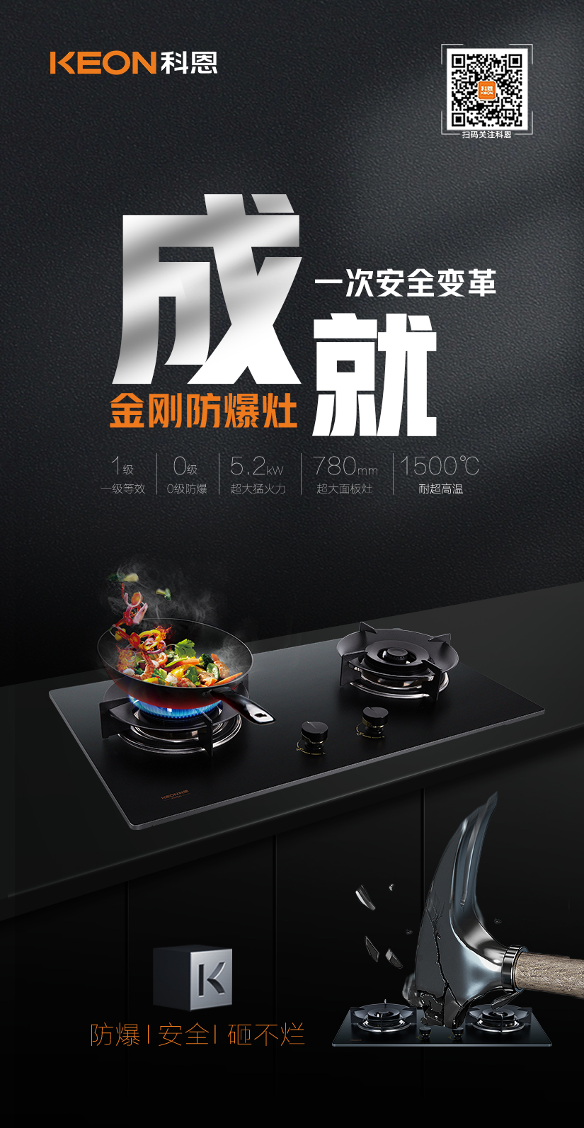 相較于市面上普通鋼化玻璃面板,科恩采用了超細晶、高均質新型硅碳合金金剛板!更堅可不摧 ,可耐高溫1500℃!真正做到防爆、安全、砸不爛!無懼各種極限考驗!
