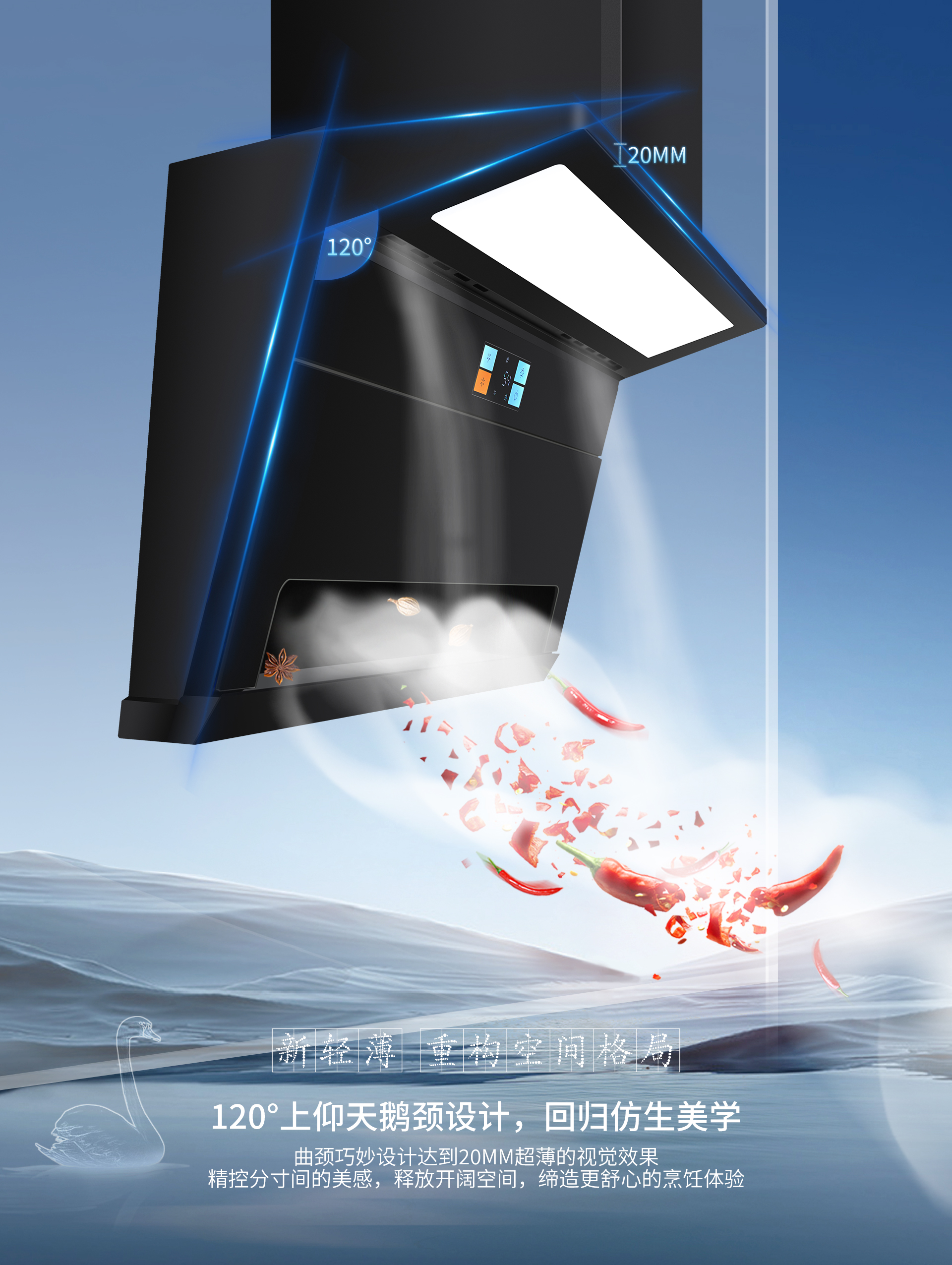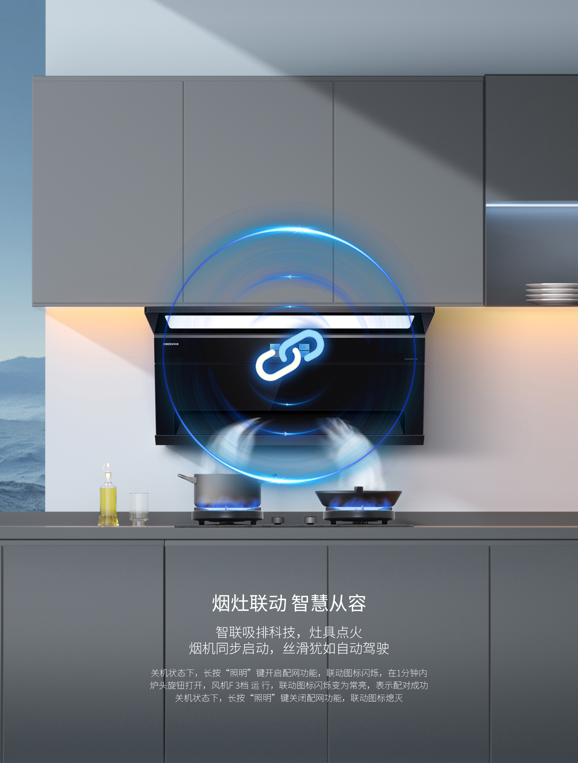 科恩7730智能聯(lián)動煙機整機采用特氟龍工藝,一體成型的設計,不僅使其具備不沾油的卓越特性,更在外觀上顯得格外美觀。這種獨特的工藝處理,讓廚房器具在日常使用與清潔過程中都變得輕松便捷,始終保持著光潔如新的狀態(tài),為廚房增添了一份精致與高雅。其新輕薄的設計重構(gòu)了廚房的空間格局。120°上仰天鵝頸設計堪稱一大亮點,曲頸的巧妙構(gòu)造營造出2.0cm超薄的視覺效果。在精控分寸之間展現(xiàn)出無與倫比的美感,同時釋放出開闊的空間,讓烹飪者能夠在寬敞舒適的環(huán)境中盡情施展廚藝,締造更為舒心愉悅的烹飪體驗。
