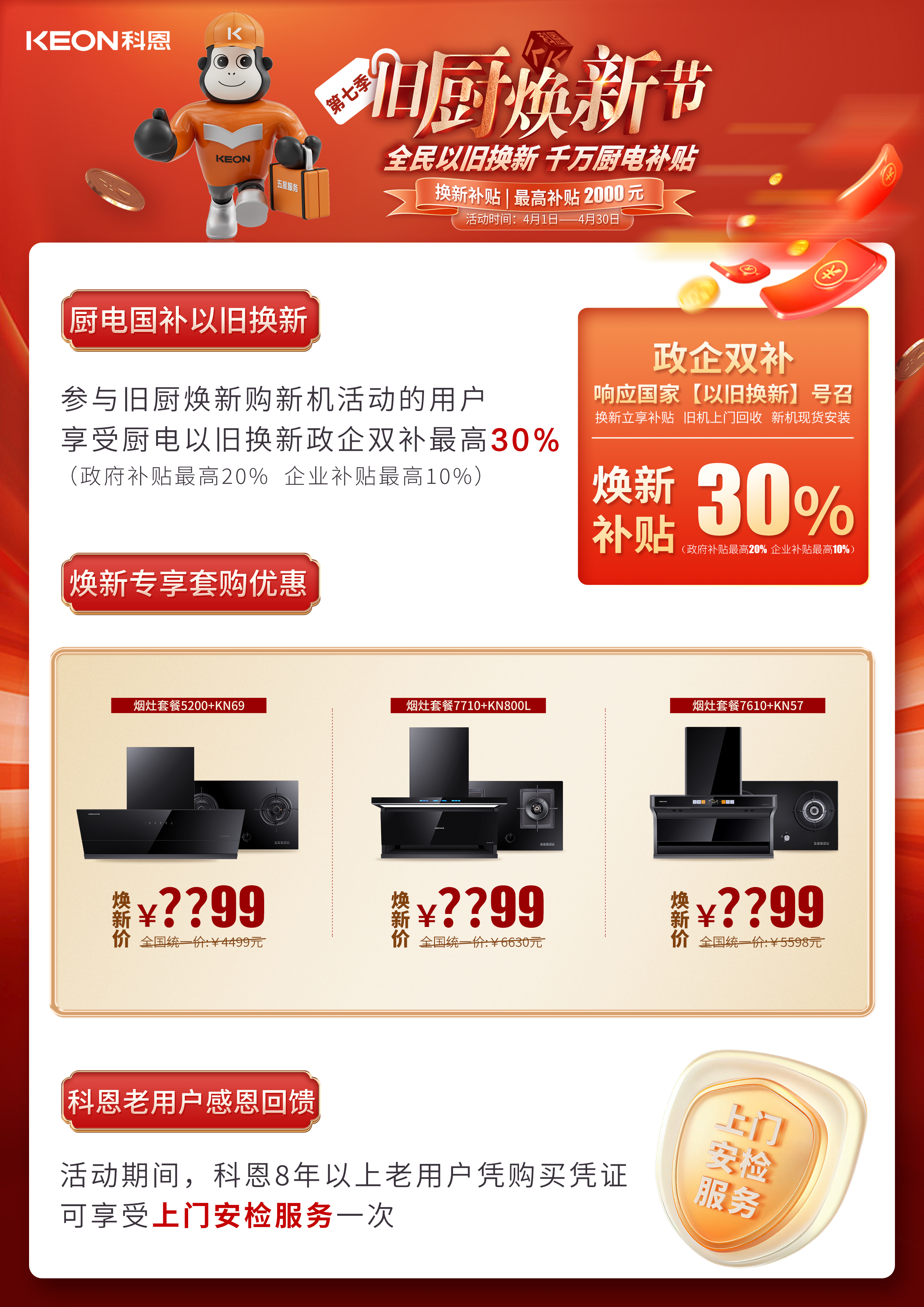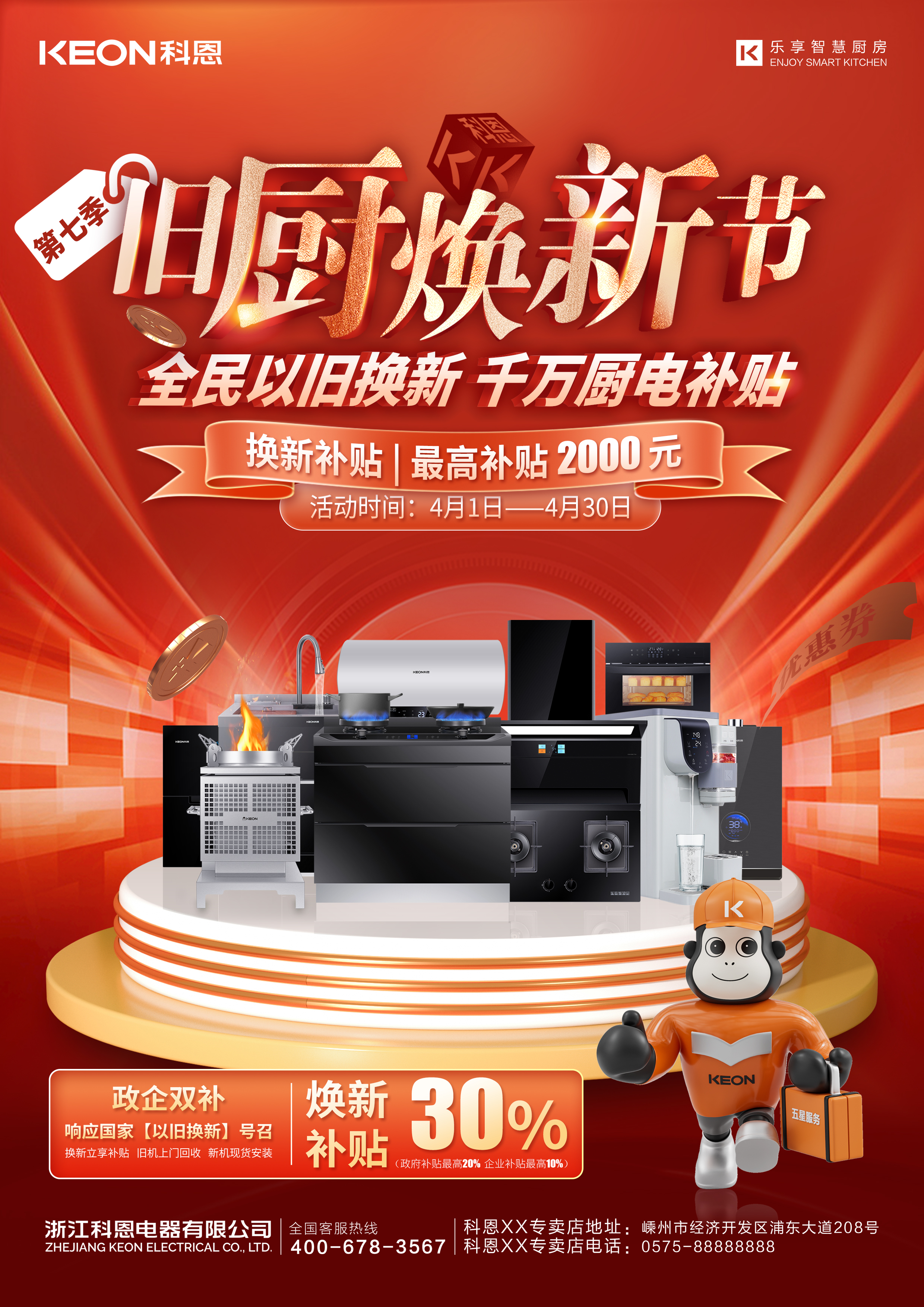 春意漸濃,煙火煥新。科恩電器四月“舊廚煥新節”全面啟動!政府補貼疊加企業補貼,雙重福利最高直抵廚電總價30%,最高可達2000元,更有煥新專享套購優惠感恩回饋等福利,讓智能廚房一步到位。