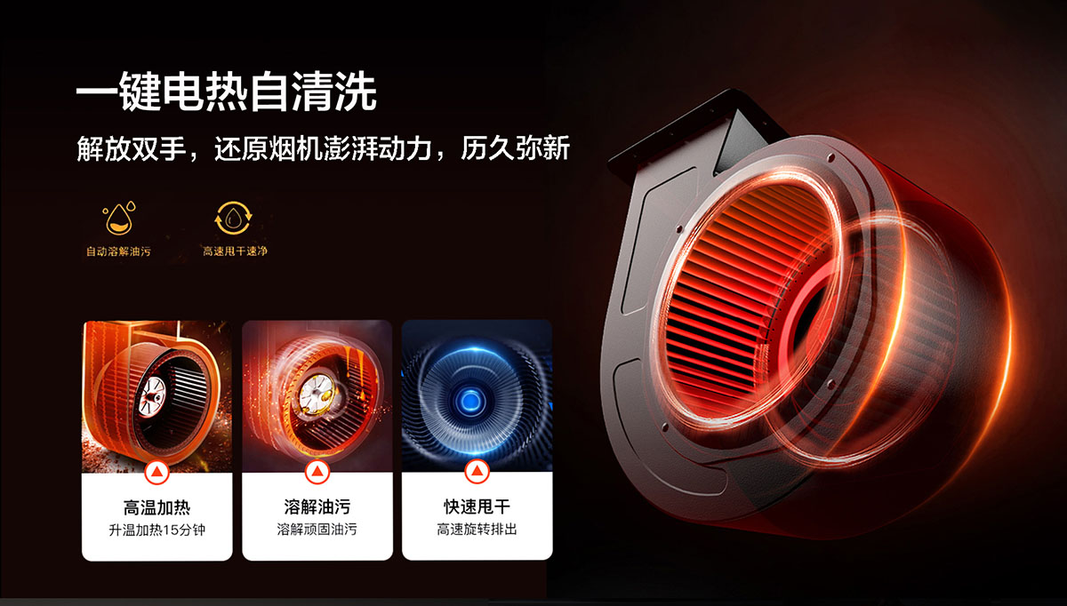 一鍵電熱自清洗,解放雙手,還原煙機澎湃動力,歷久彌新