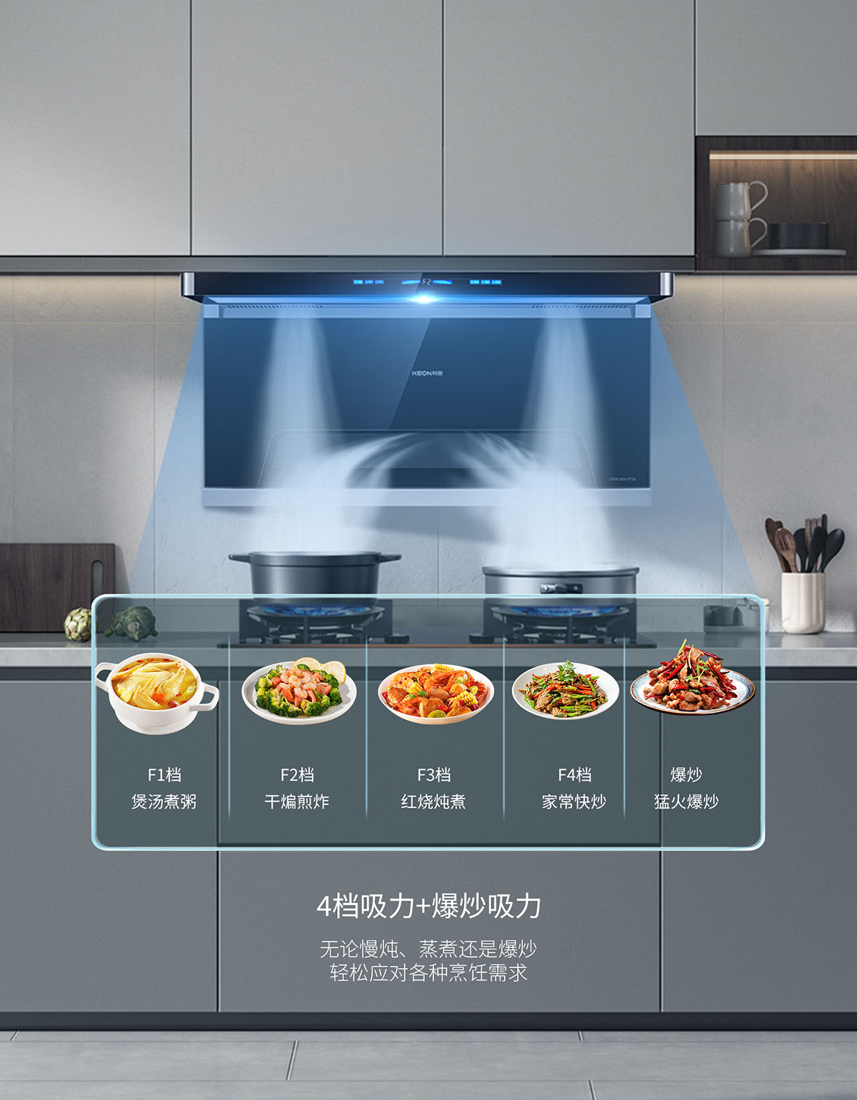 一鍵23.5m³/min爆炒大吸力,無(wú)懼重油爆炒
